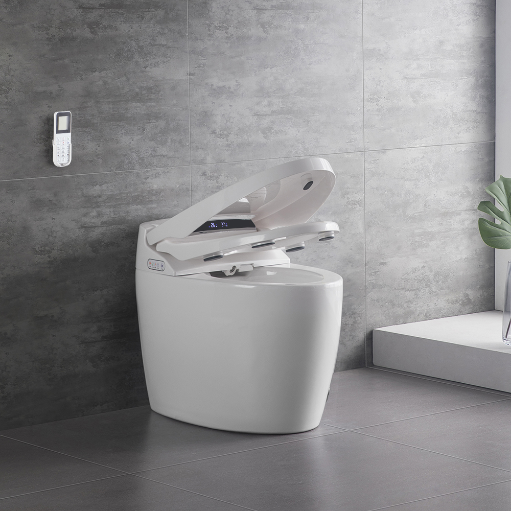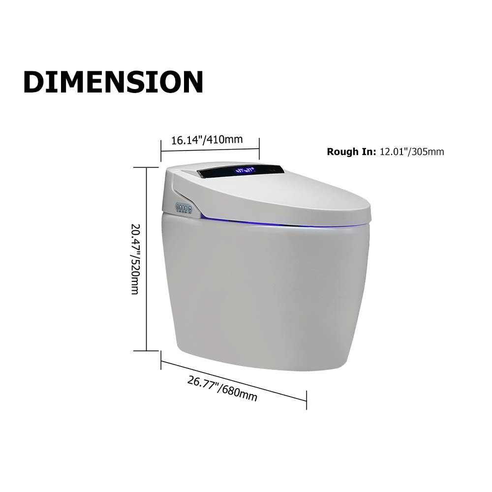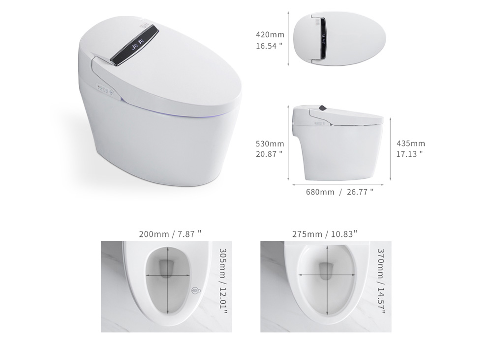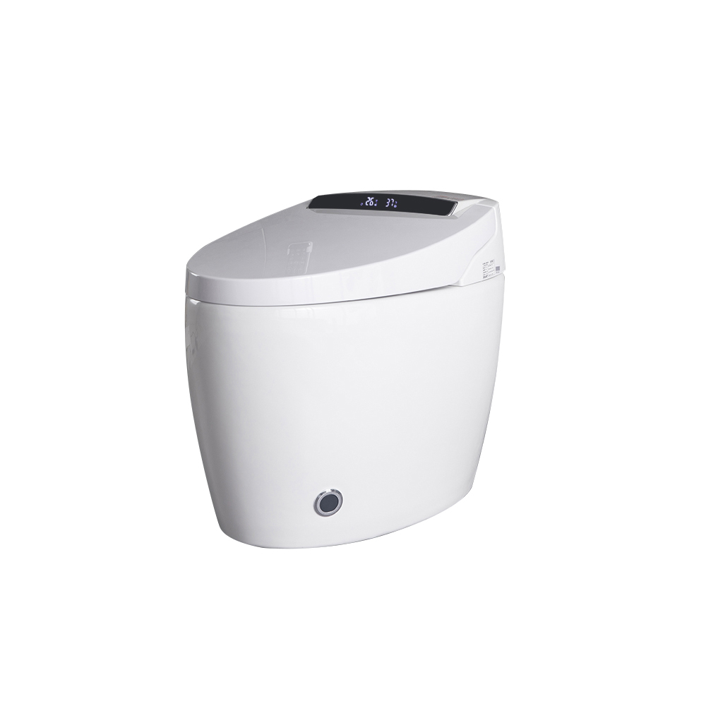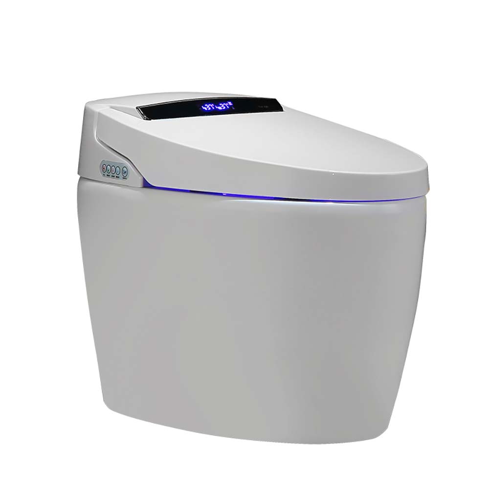 Цей розумний унітаз сучасного дизайну відрізняється елегантним дизайном без бачка та автоматичною системою змиву, що забезпечує простоту використання. Розумний унітаз без резервуара є неперевершеним поєднанням найкращих характеристик звичайного високоякісного керамічного унітазу з інноваціями сучасного вдосконаленого унітазу з такими декадентськими функціями, як підігрів сидінь, проточна тепла вода, сушіння повітрям та багато іншого. Крім того, екологічний та гігієнічний унітаз без бачка усуває майже всі потреби в унітазному папері або вологих серветках, оскільки форсунки, включені до цієї моделі, є найбільш ефективним варіантом на ринку в даний час.