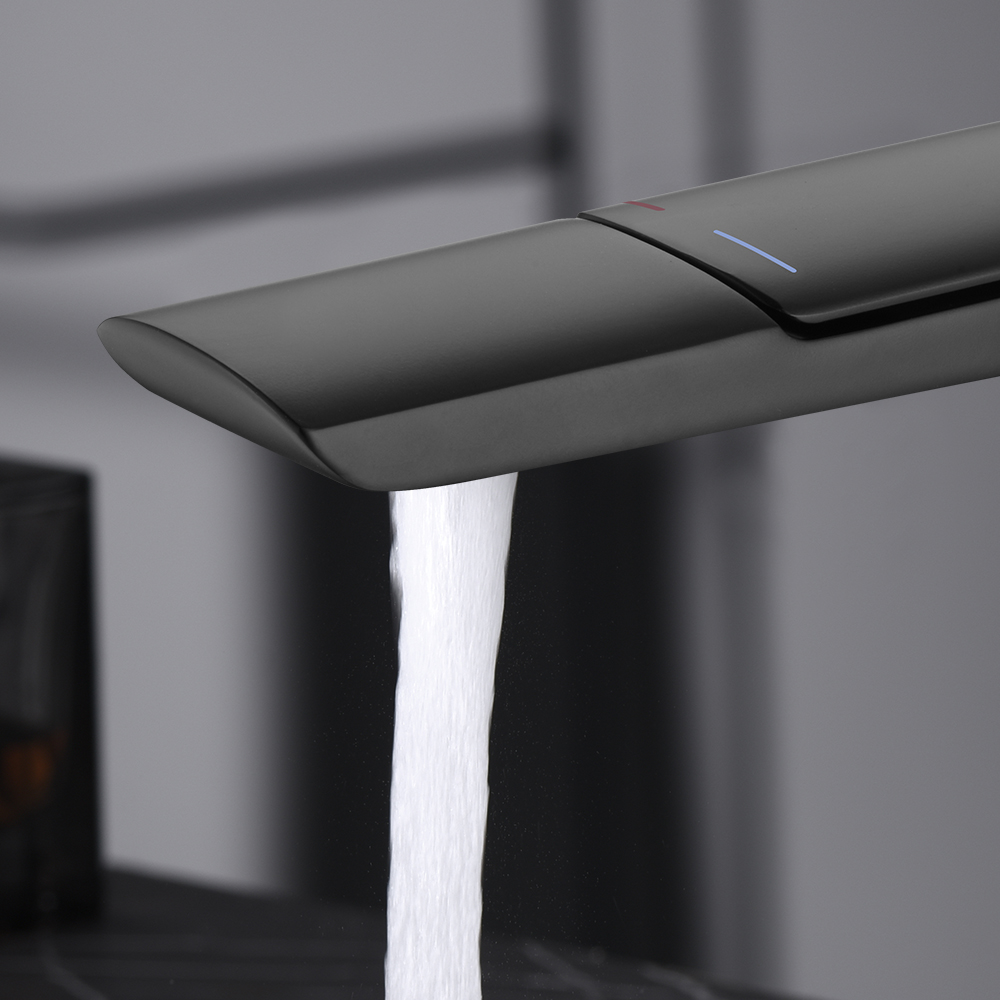 Завдяки чарівному основному корпусу з гладкими лініями, цей змішувач має стати центральним елементом вашої ванної кімнати, пропонуючи мінімалістську естетичну привабливість. Вилив з плавно вигнутим зливом забезпечує подачу газованої води без бризок, завдяки чому будь-яке миття стає легким, а чіткі гладкі лінії надають виробу вишуканого вигляду. Кнопка є перемикачем цієї частини, і ви можете точно та плавно контролювати температуру води та потік, керуючи ручкою. Принесіть його додому та освіжіть інтер'єр ванної кімнати.